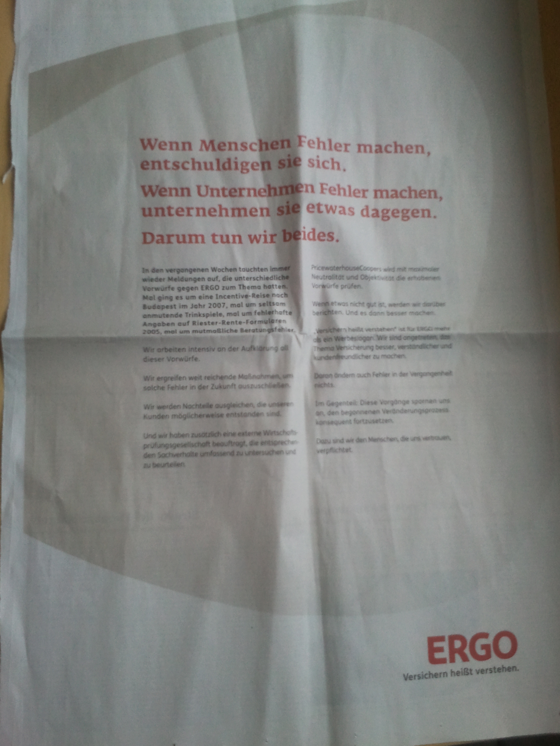 Man glaubt es kaum, aber bei ERGO bewegen sie sich doch! Gut zwei Monate nach dem Bekanntwerden denkwürdiger Incentive-Reisen (sie haben eigentlich alles richtig gemacht…), denkwürdiger Trinkrituale (Tequila trinkt man durch die Nase…) und denkwürdiger Ansichten („unsere neue Kampagne hat ja eh noch keiner wahrgenommen“) kam man bei ERGO nun auf die Idee, dass eine Entschuldigung vielleicht gar nicht so fehl am Platze wäre…wow! Besser spät als gar nicht.