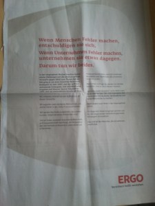 Doch das Timing war denkbar schlecht. Entschuldigungen sollten zeitnah kommen – und nicht erst, nachdem alle internen Instanzen daran herumgedoktert haben. Denn zwischenzeitlich existieren ja wunderbare Werbeparodien, die z.B. aus ERGO „Orgie“ machen – und die mit Sicherheit länger in den Köpfen der Konsumenten hängen bleiben werden als eine großformatige Anzeige.