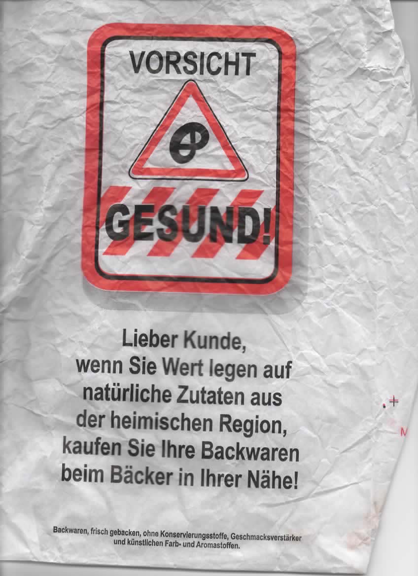 Achtung, lieber Kunde, der Inhalt dieser Tüte ist gesund!! Iii bäh! Bloss nicht kaufen. Lieber Backwaren beim Bäcker in der Nähe erwerben. Moment mal… das hab ich doch gerade getan. Sonst würde ich doch diese Tüte nicht in den Händen halten… häääh?? Wie jetzt ? Nochmal: Also ich lege Wert auf natürliche Zutaten und habe das Brot beim Bäcker gekauft, darf das aber nun nicht essen, weil „Vorsicht, gesund!“??