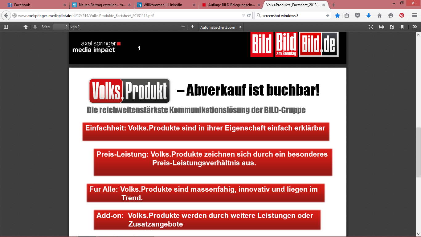 Anzeigen, Beileger, Banner bei BILD.de usw. erreichen eine Vielzahl von Menschen und verkaufen so gut wie jedes Produkt von selbst. Oder, wie die BILD es selbst vermarktet: Abverkauf ist buchbar!