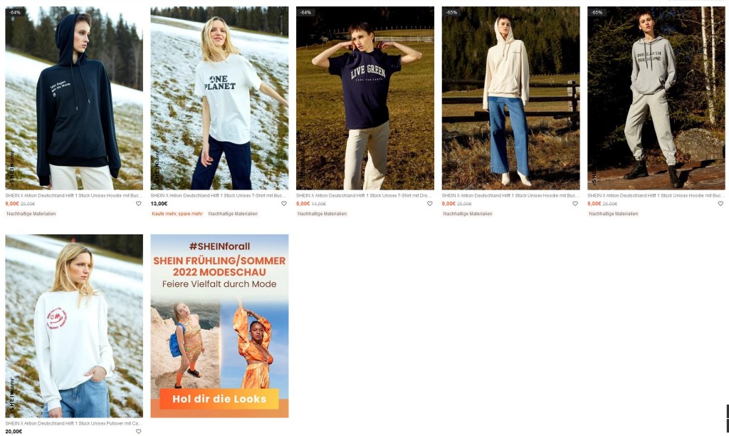 Natürlich behauptet auch Shein auf seiner Website, sich für Umwelt und Gesellschaft einzusetzen – aber das ist Green Washing aller bester Güte. Die Zusammenarbeit mit der „Aktion Deutschland hilft“ hat zu ganzen 6 (!) Produkten geführt (kurz zum Vergleich: es gibt allein über 30.000 verschiedene T-Shirts), die aus nicht näher spezifizierten „nachhaltigen Materialen“ hergestellt werden – die genannten Zertifikate sind ohnehin wohlklingende Erfindungen. Ganze 10% der Einnahmen (aus dieser Kollektion, wohlgemerkt) werden weitergeleitet. 5.000,- € sind bislang gesprendet worden….Ach so, der Jahresumsatz 2020 von Shein wurde von Bloomberg auf 10 Milliarden US-Dollar geschätzt.