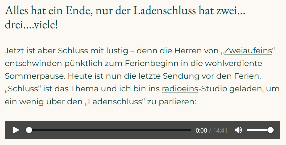 Diesen Sonntag dreht es sich bei „radioeins“ um „Sonne“ – und von da ist es nur ein kleiner Schritt zu „Sonntag“ und damit sind wir schon mitten im Thema „Sonntagsruhe“. Nachzuhören ist das Interview wie immer hier: